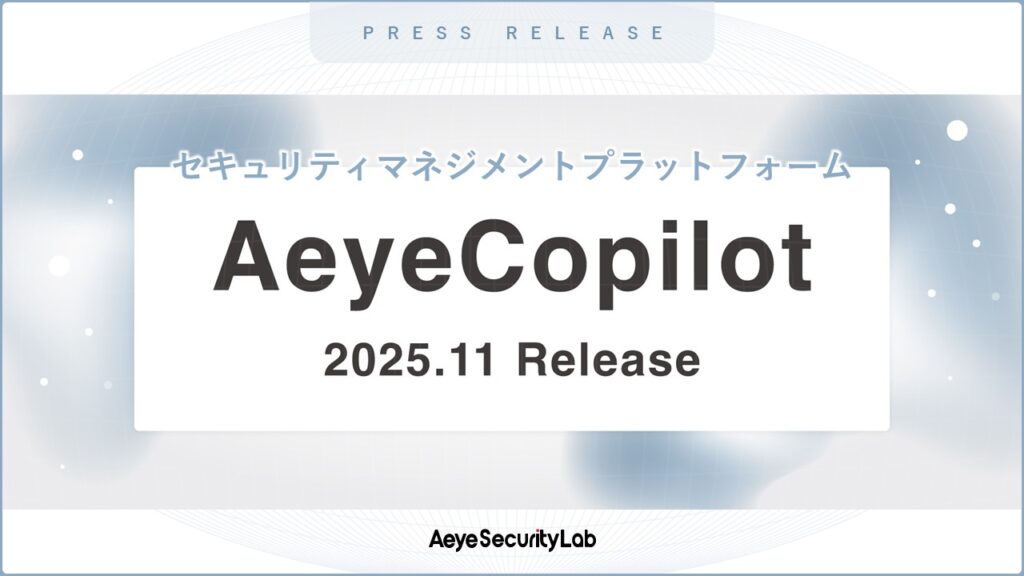 クラウド型Webアプリケーション脆弱性診断ツール「AeyeScan」を提供する株式会社エーアイセキュリティラボは、2025年4月にβ版公開以来、多くの反響をいただいた ”セキュリティマネジメントプラットフォーム”「AeyeCopilot」の正式版を11月より提供開始します。