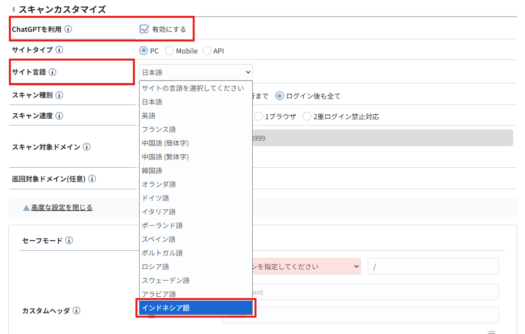 [スキャン一覧] > [新規スキャン] > [スキャン基本オプション] > [ChatGPTを利用]の「有効にする」にチェックを入れると、[サイト言語]から言語を選択いただけます。